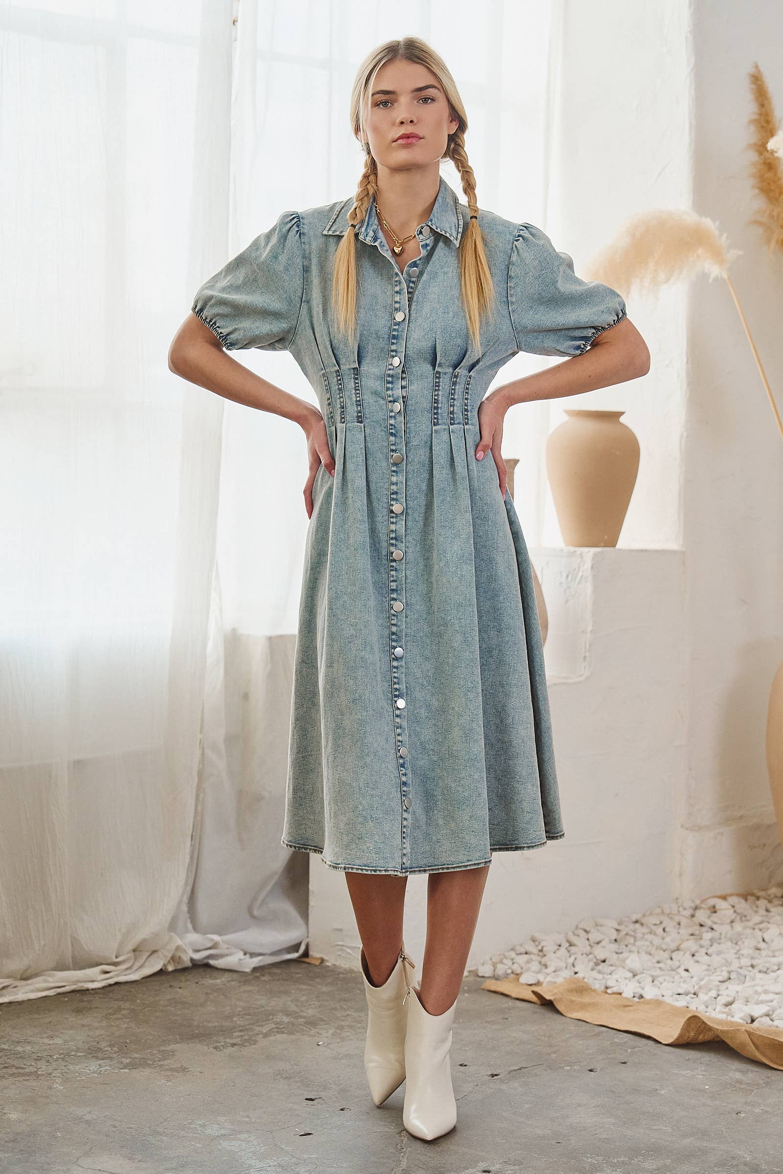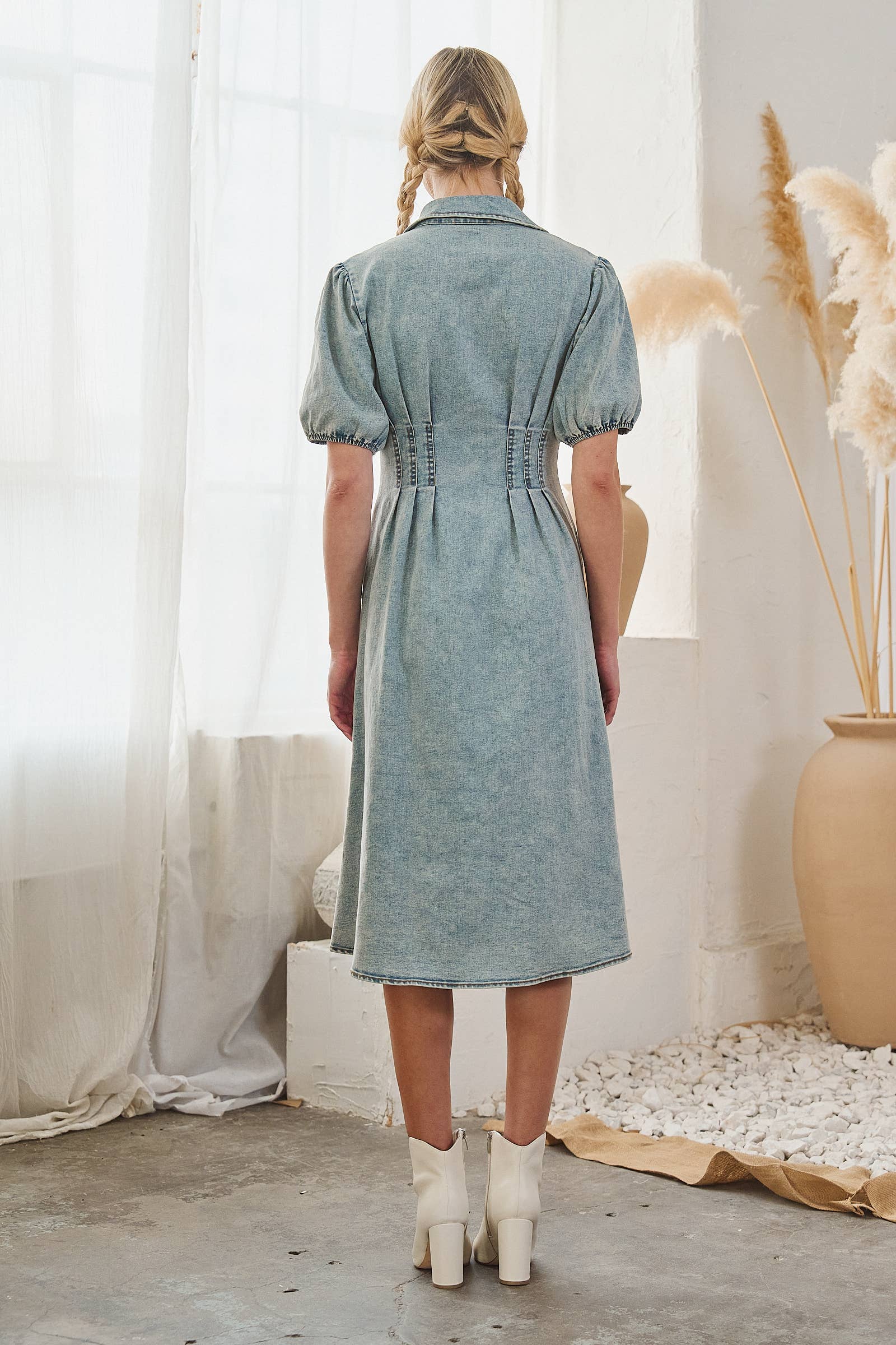 Collared neckline - Short puff sleeves - Front snap button closure - Structured seam detail at waist - Flared A-line silhouette - Washed denim fabric - Midi length